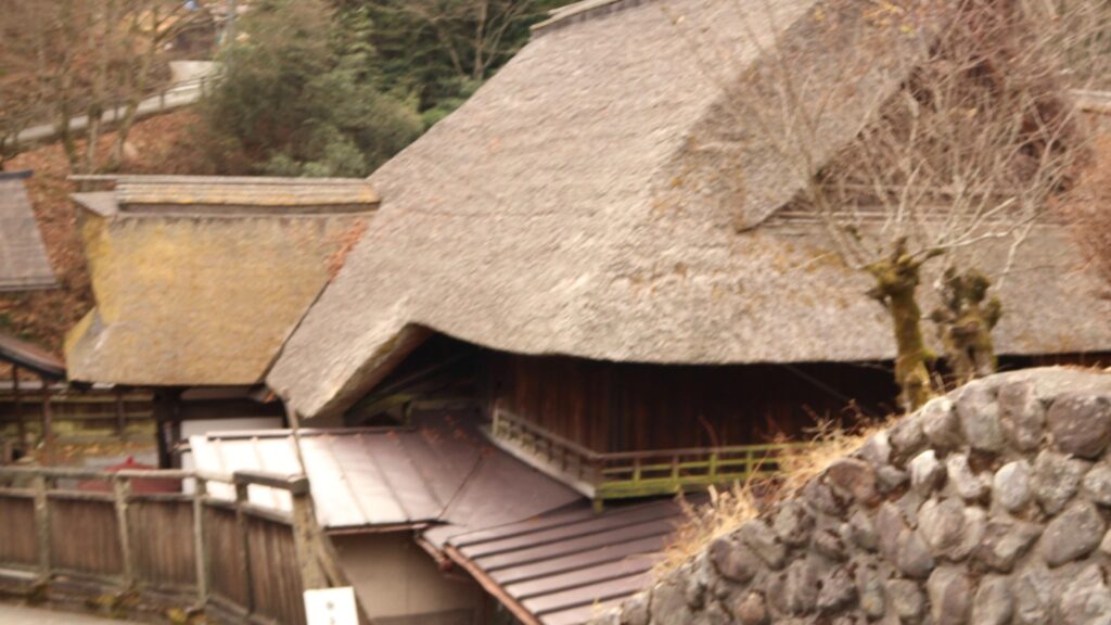 神社までの道には宿坊やおみやげ屋さんなど色々ありました。その中でもかやぶき屋根の建物はすごかったです。