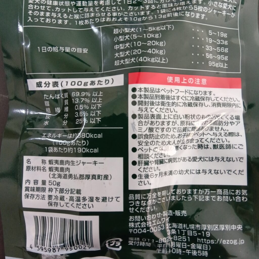 鹿肉100%なのが安心ですね。しかもヒューマングレードと記載があるので食品衛生法にのっとっているのが分かって安心さらに安心ですね。